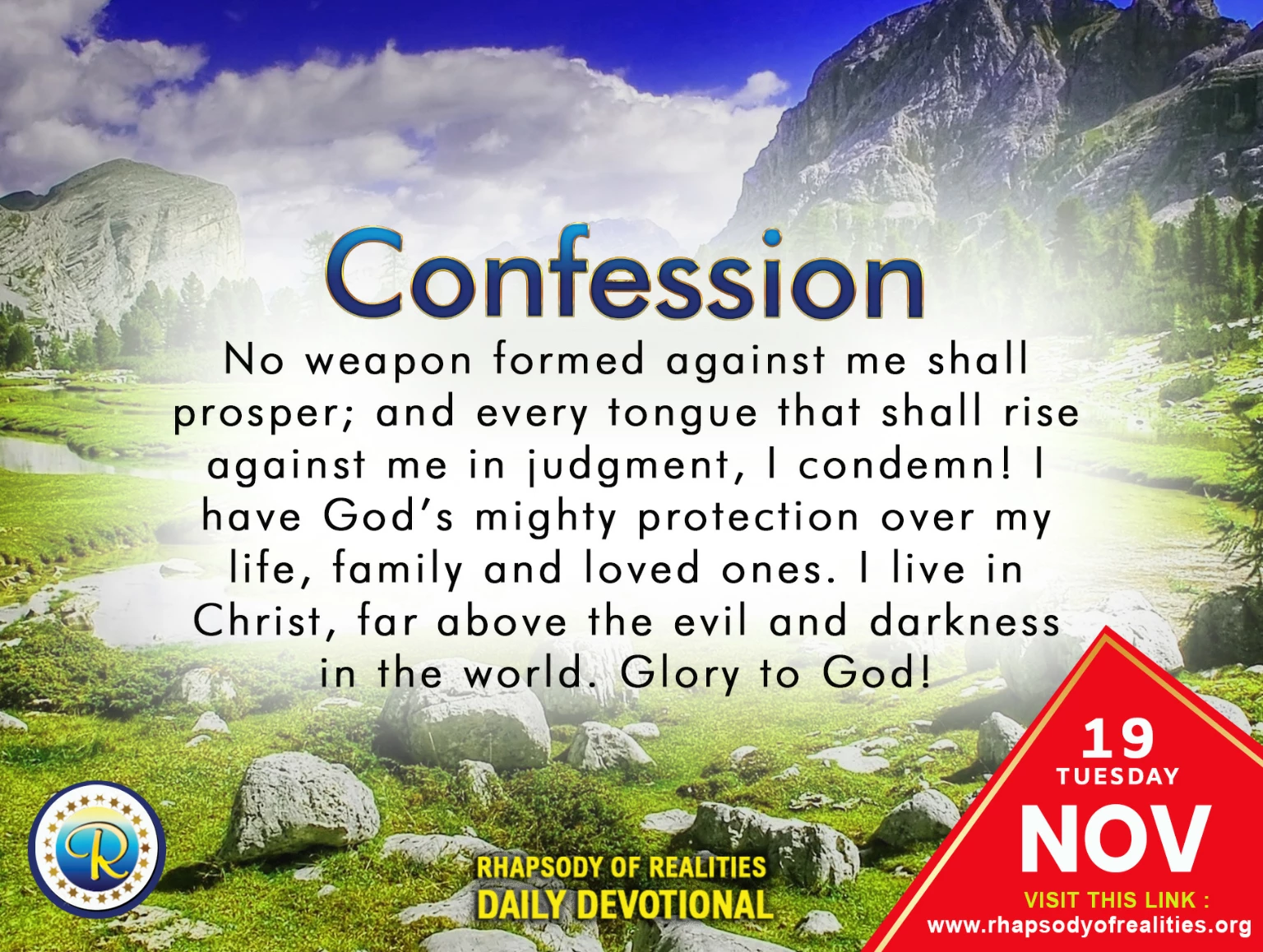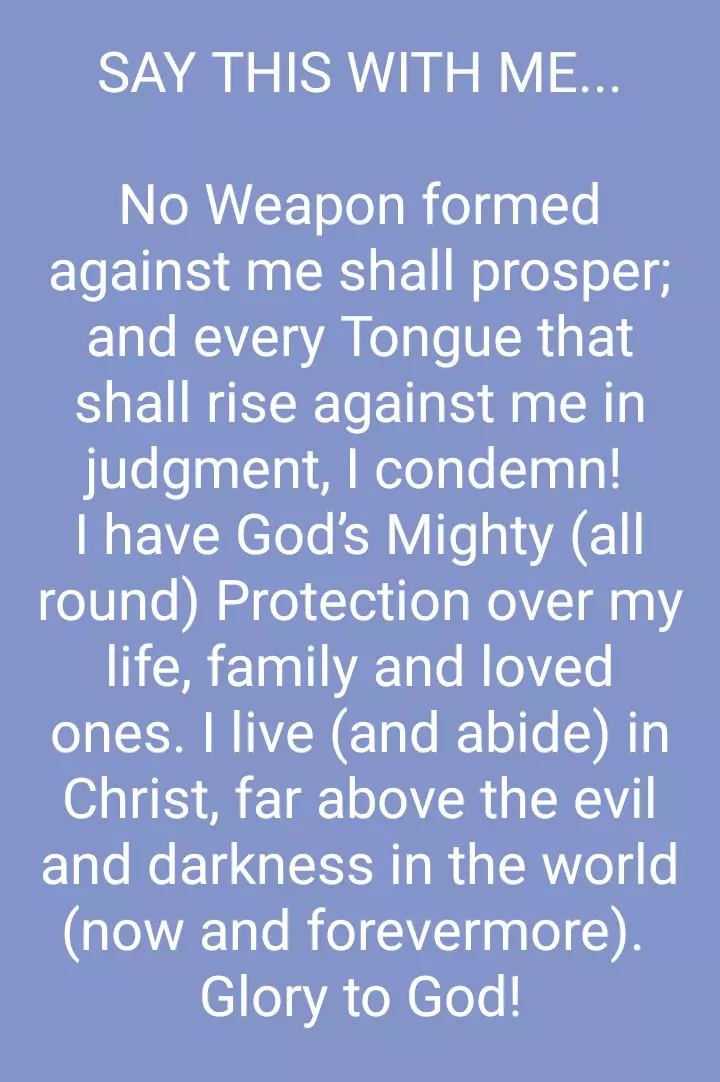 My declaration today is no weapon formed against me shall prosper and every tongue that rises up in lord, though i fear no evil for i've done no evil i lay my confidence in you for you are my lord, my shepherd and my shield amen!